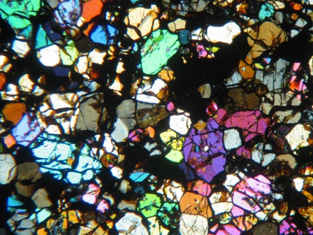 We see chondrules, relict chondrules and a well metamorphosed matrix. The texture is like a type 5 or 6 chondrite. This appears similar to the thin section shown in Lauretta & Killgore pp. 232–235 as NWA 1054 Winonaite though NWA 1054 is now classified as an acapulcoite.
